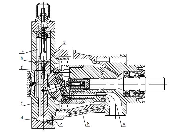 主體部分(參見結(jié)構(gòu)剖)由傳動(dòng)軸帶動(dòng)缸體旋轉(zhuǎn),使均勻分布在缸體上的七個(gè)柱塞繞傳動(dòng)軸中心線轉(zhuǎn)動(dòng),通過中心彈簧將柱滑組件中的滑靴壓在變量頭(或斜盤)上。這樣,柱塞隨著缸體的旋轉(zhuǎn)而作往復(fù)運(yùn)動(dòng),完成吸油和壓油動(dòng)作。 壓力補(bǔ)償變量泵的出口流量隨出口壓力的大小近似地在一定范圍內(nèi)按恒功率曲線變化。當(dāng)來自主體部分的高壓油通過通道(a)、(b)、(c)進(jìn)入變量殼體下腔(d)后,油液經(jīng)通道(e)分別進(jìn)入通道(f)和(h),當(dāng)彈簧的作用力大于由油道(f)進(jìn)入伺服活塞下端環(huán)形面積上的液壓推力時(shí),則油液經(jīng)(h)到上腔(g),推動(dòng)變量活塞向下運(yùn)動(dòng),使泵的流量增加。當(dāng)作用于伺服活塞下端環(huán)形面積上的液壓推力大于彈簧的作用力時(shí),則伺服活塞向上運(yùn)動(dòng),堵塞通道(h),使(g)腔的油通過(i)腔而卸壓,此時(shí),變量活塞上移,變量頭偏角減小,使泵的流量減小。 調(diào)節(jié)流量特性時(shí),可先將限位螺釘擰至上端,根據(jù)所需的流量和壓力變化范圍,調(diào)節(jié)彈簧套,使其流量開始發(fā)生變化時(shí)的初始?jí)毫Ψ弦?,然后將限位螺釘擰至終級(jí)壓力時(shí)的流量不再發(fā)生變化,其中間的流量與壓力變化關(guān)系由泵的本身設(shè)計(jì)所決定。