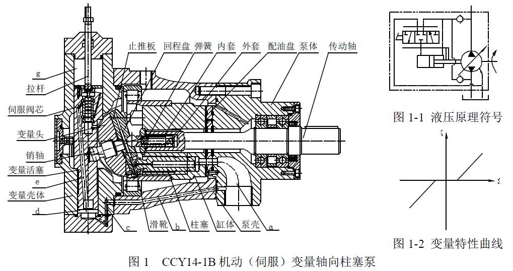泵的液壓原理見圖 1-1,變量特性見圖1-2。本泵特別適用于閉式油路液壓系統(tǒng)和頻繁變量(每一工作循環(huán)都需變量)的開式油路系統(tǒng)之中,其操縱可以采用手動杠桿機構、凸輪機構以及汽缸、液壓缸等各種方式。