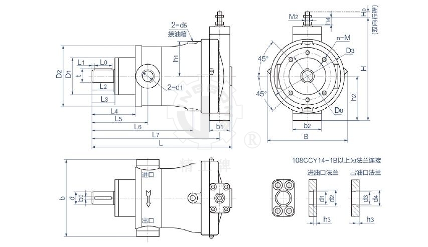 CY14-1B 系列泵是采用缸體旋轉,靠變量頭(斜盤)變量的軸向柱塞泵。由于滑靴和變量頭之間、配油盤和缸體之間采用了液壓靜力平衡的油膜厚度設計,使上述兩對運動面之間處在純液體磨擦下運轉,并省去了重型推力軸承,因而與其它類型的泵相比,具有結構簡單、體積小、效率高、重量輕、噪音低、壽命長、自吸能力強等優(yōu)點,它適用于鍛壓機械、機床、船舶、航空、冶金機械、塑料機械、工程機械和礦山機械等液壓設備。